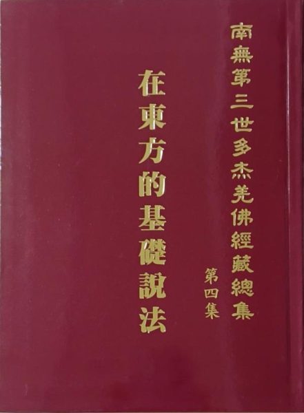 《在東方的基礎說法》是南無第三世多杰羌佛於一九九五年面向所有弟子公開發行的第一套法音,結集了南無羌佛(當時人們尚不知道南無羌佛的佛陀身份,而只知道是義雲高大師)在一九九二年至一九九四年間所作的部分說法和開示。